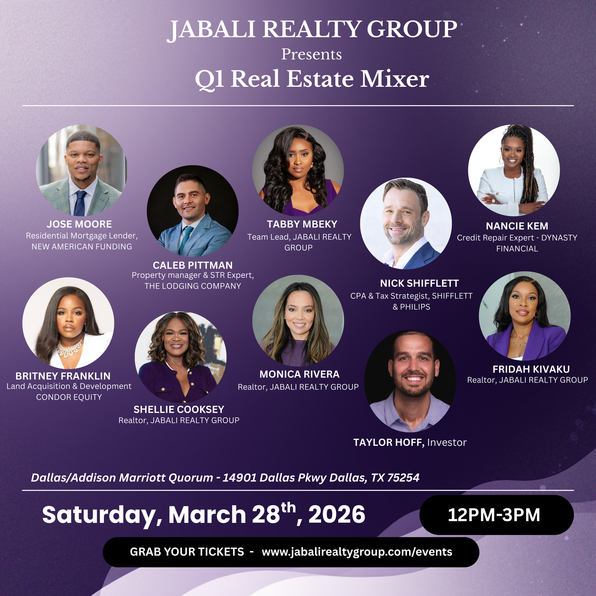 Join Jabali Realty Group on Saturday, March 28, 2026, from 12:00 PM to 3:00 PM at the Dallas/Addison Marriott Quorum by the Galleria (14901 Dallas Pkwy, Dallas, TX 75254) for a Real Estate Panel & Mixer bringing together professionals from across the industry.